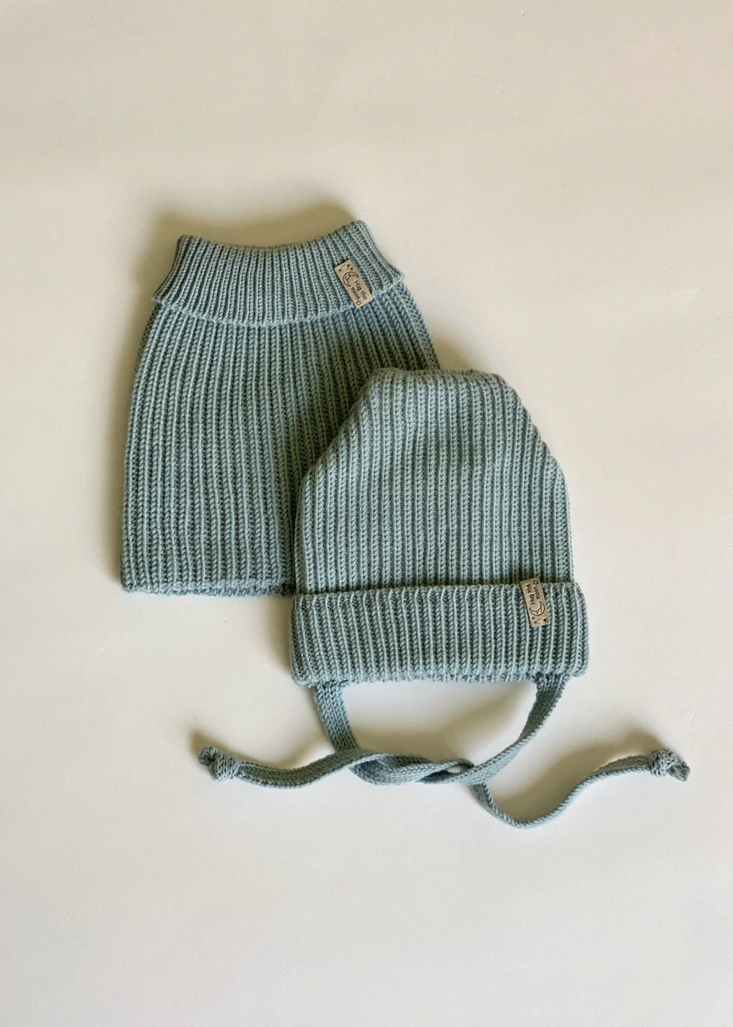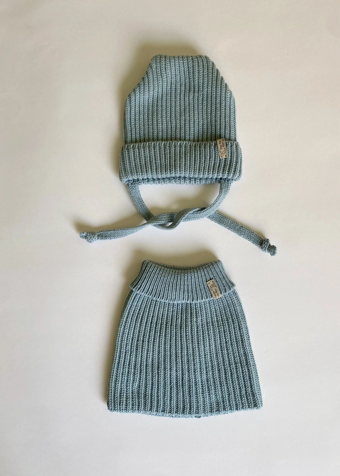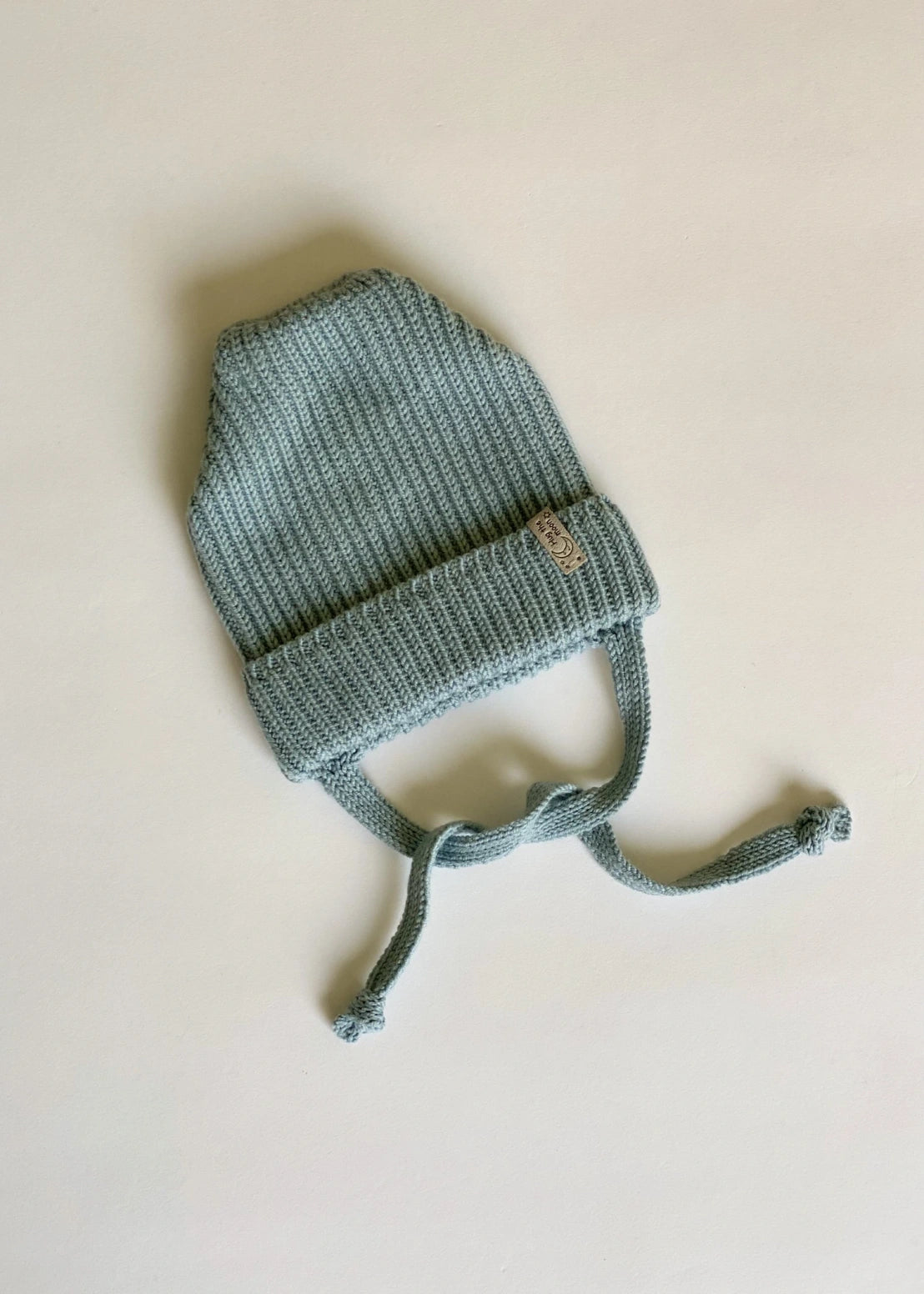 - Kepurė megzta stulpelių raštu, su atlenkiamu kraštu ir raišteliais.