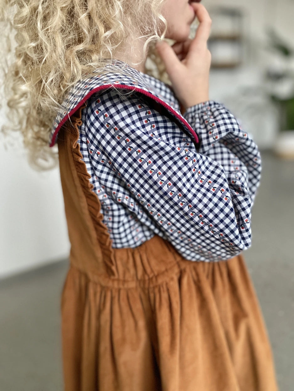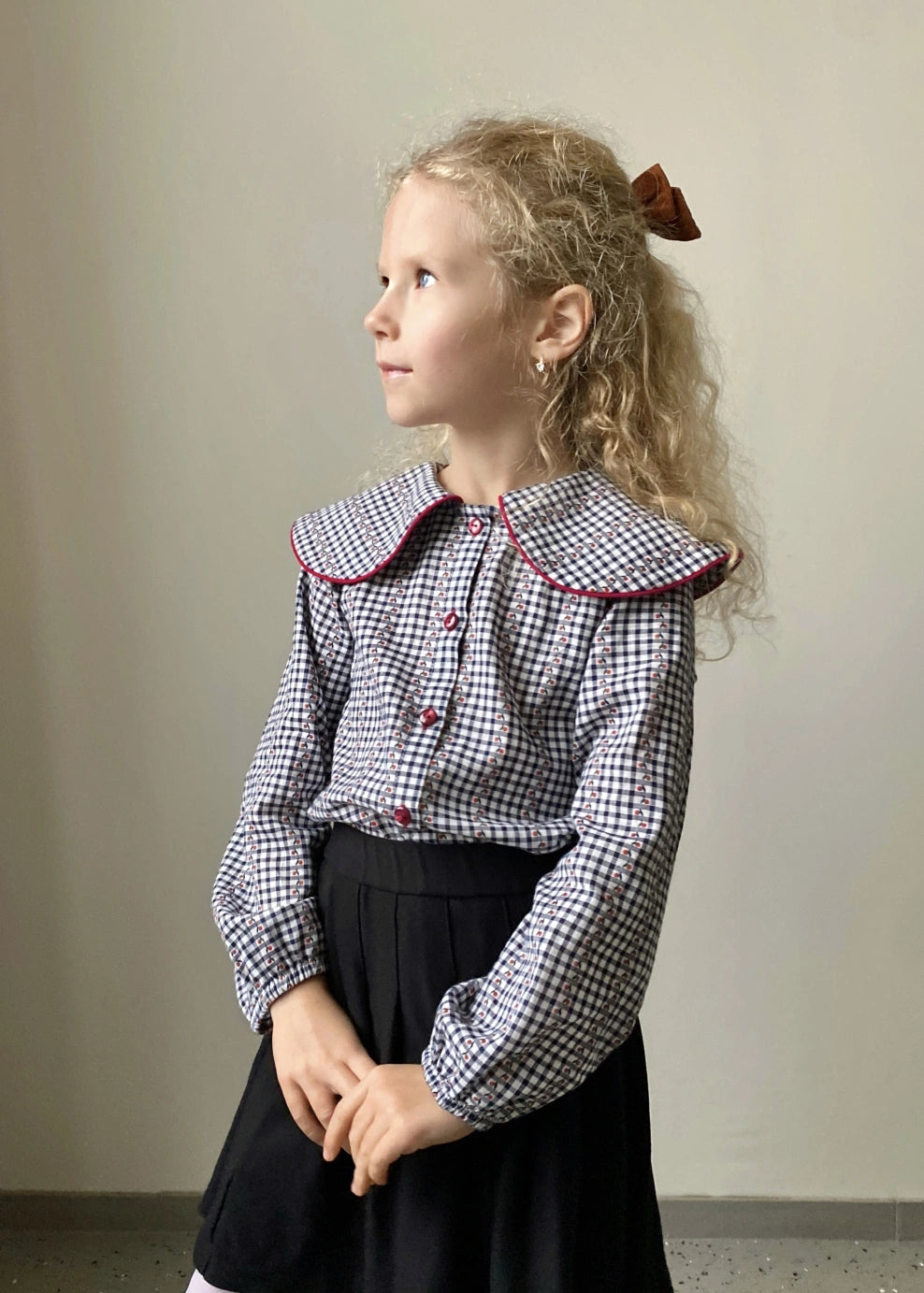 Klasikinio, elegantiško dizaino marškiniai mergaitei su apykakle. Marškiniai pasiūti iš minkštos medvilnės ir yra labai patogūs kasdieniam dėvėjimui. Smulkus languotas raštas suteikia žaismingumo, o didelė raudona kantavimo juostele dekoruota apykaklė išskirtinumo. Marškiniai užsegami dekoratyvinėmis raudonomis sagutėmis. Tai puikus pasirinkimas šventėms ar stilingam kasdieniam įvaizdžiui.