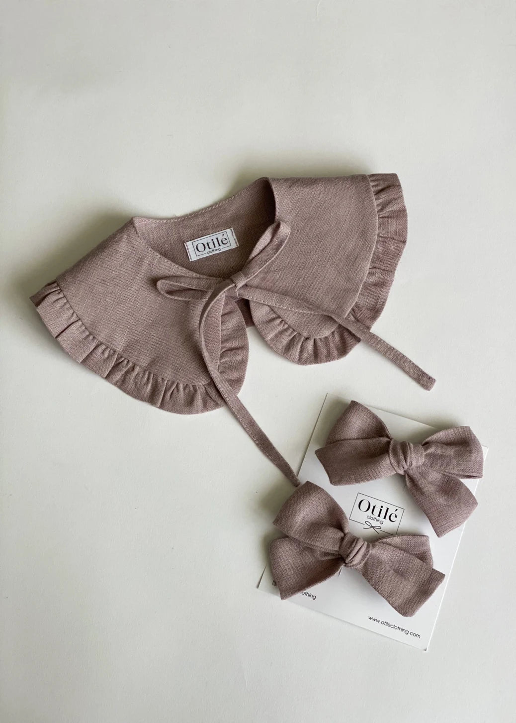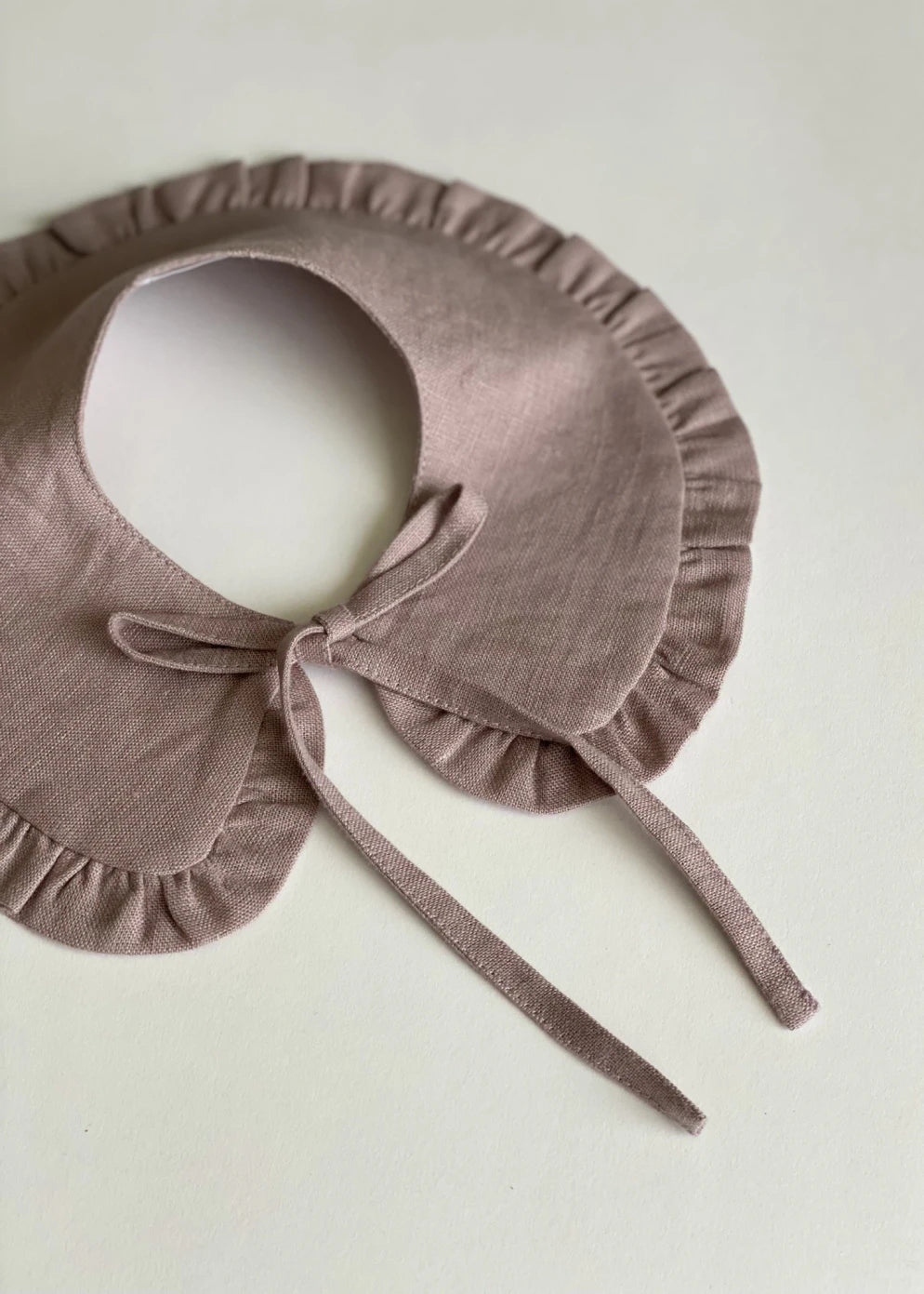 Uždedama lininė apykaklė mergaitei. Apykaklę galite derinti prie suknelių, megztinių, džemperių, marškinėlių kaskart sukuriant naują stilių.
